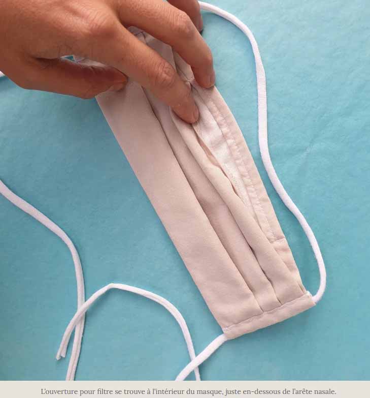 Chaque masque (masques à 3 couches uniquement) comporte une ouverture permettant d’insérer un filtre jetable. Il est recommandé d’employer 1 ou 2 couches de papier essuie-tout en guise de filtre et de les jeter après chaque utilisation. (l’ouverture pour filtre se trouve à l’intérieur du masque, juste en-dessous de l’arête nasale)