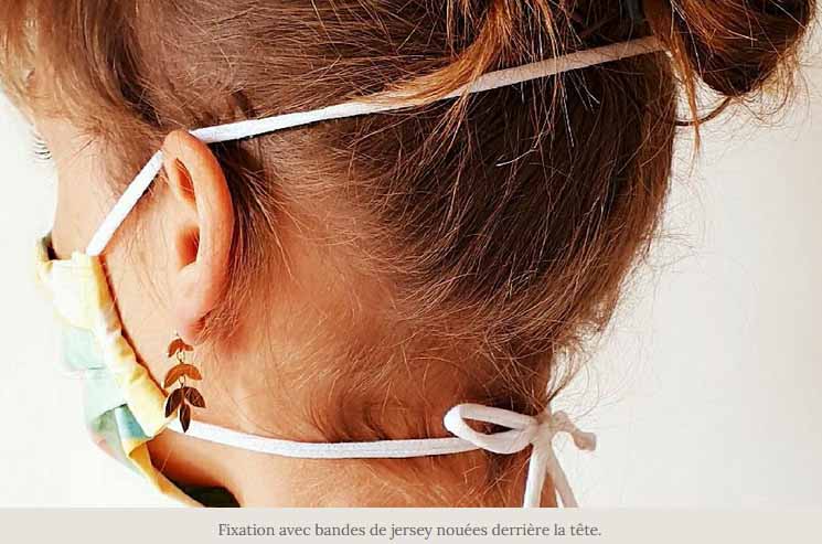 Nos masques peuvent se fixer de deux façons, selon les préférences de chacun(es) (choix à faire lors de la commande). Soit avec des élastiques ajustables derrière les oreilles (standard), soit avec une bande de jersey qui se noue derrière la tête (photo ci-contre).