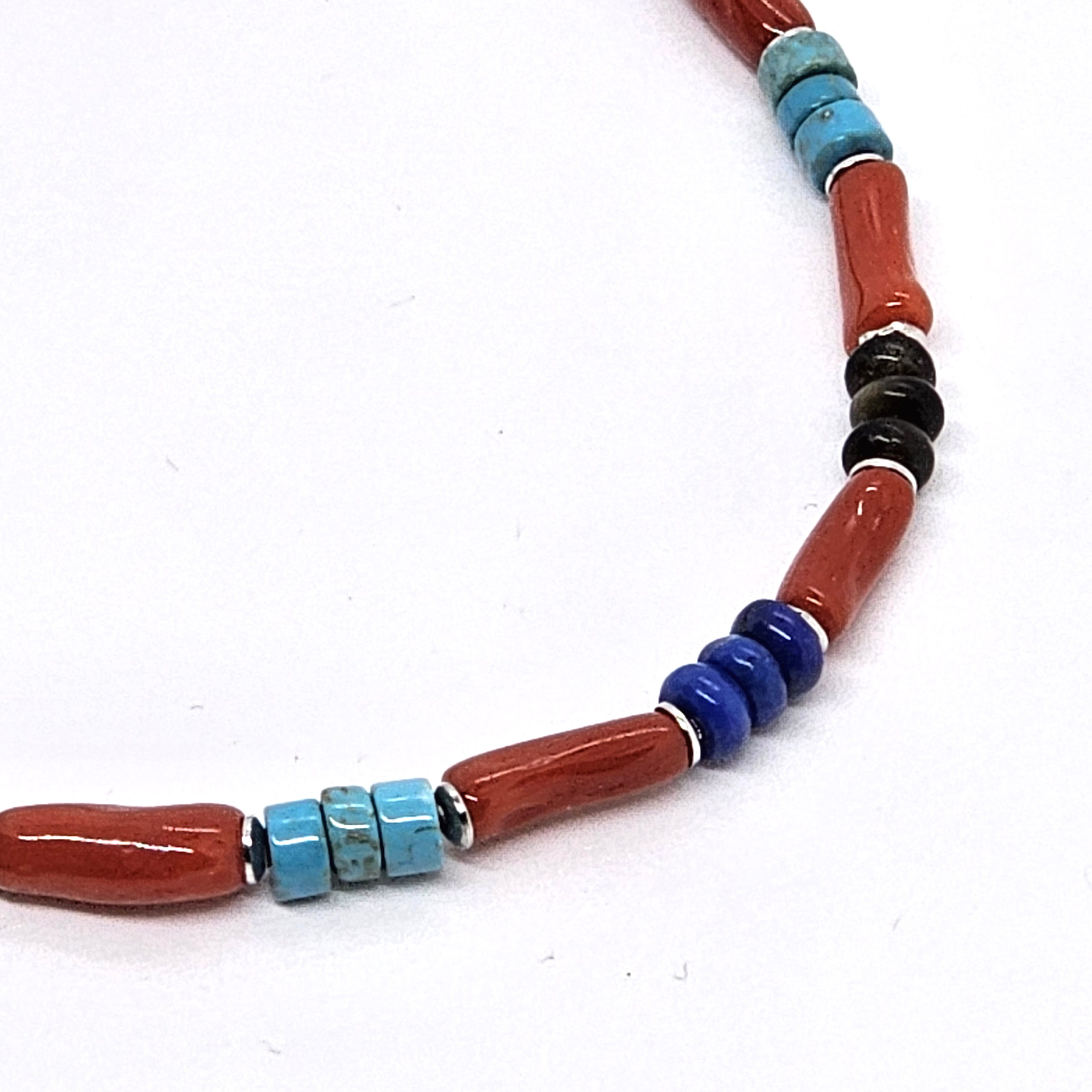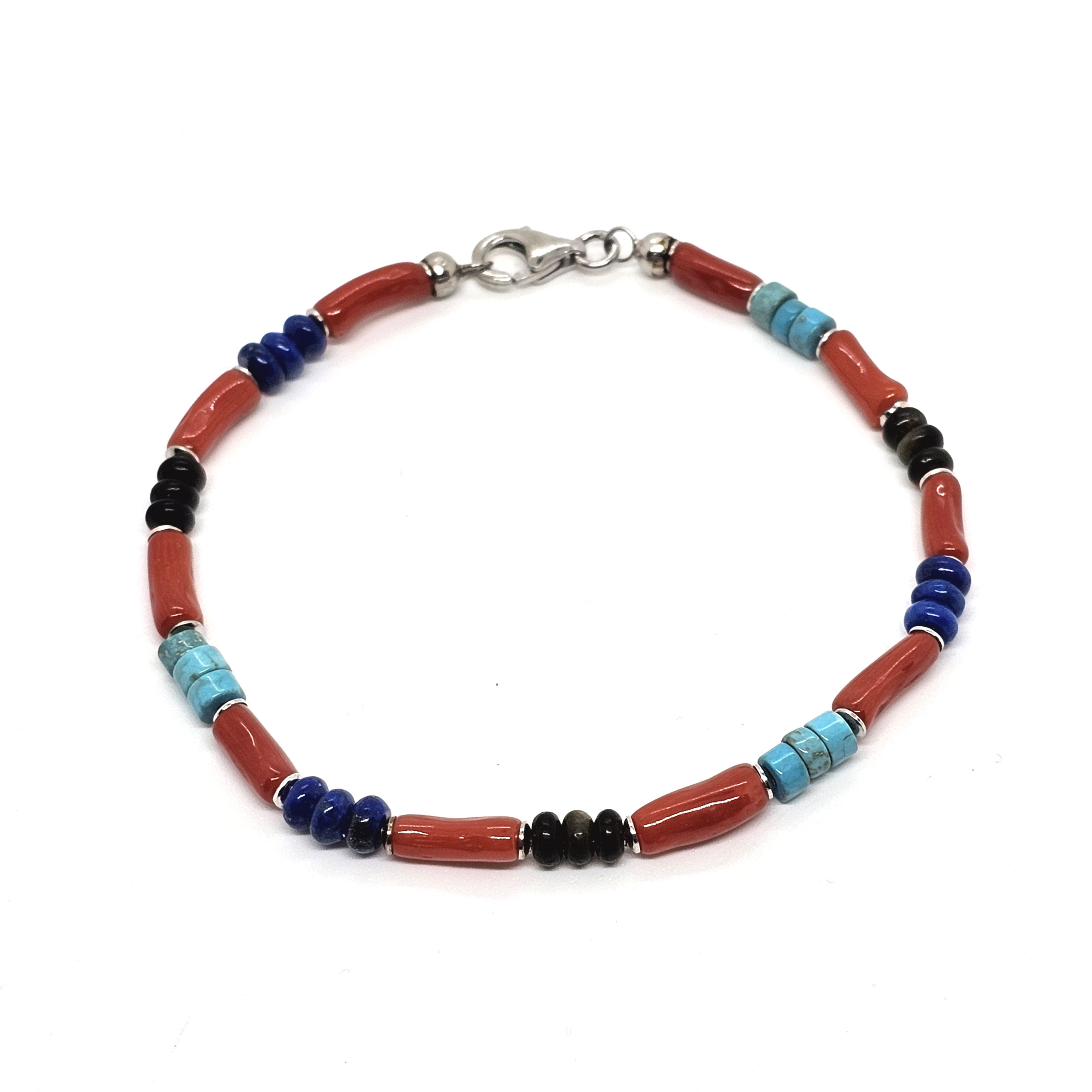 Bracelet Corail, turquoise, LapisLazuli, Onyx et argent.