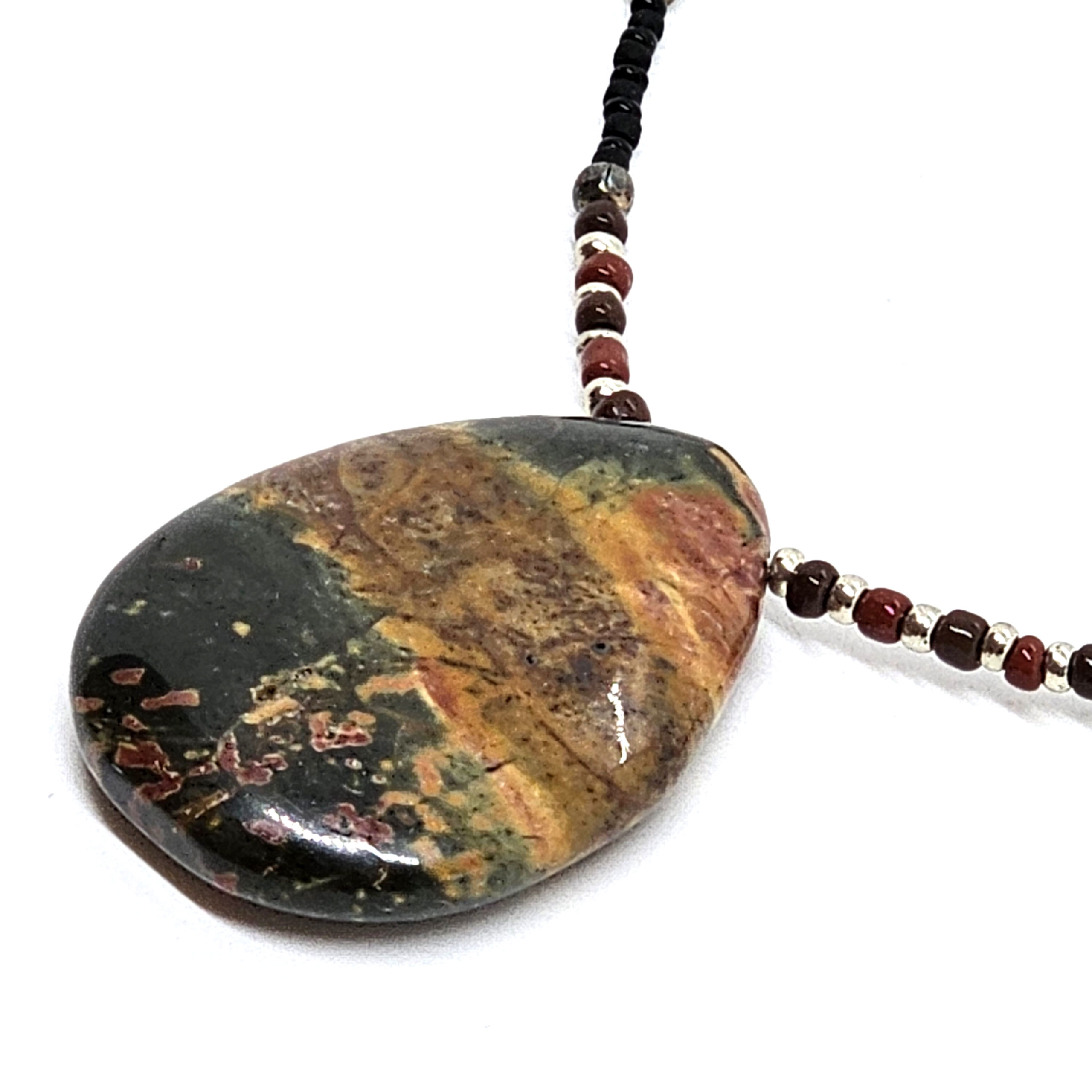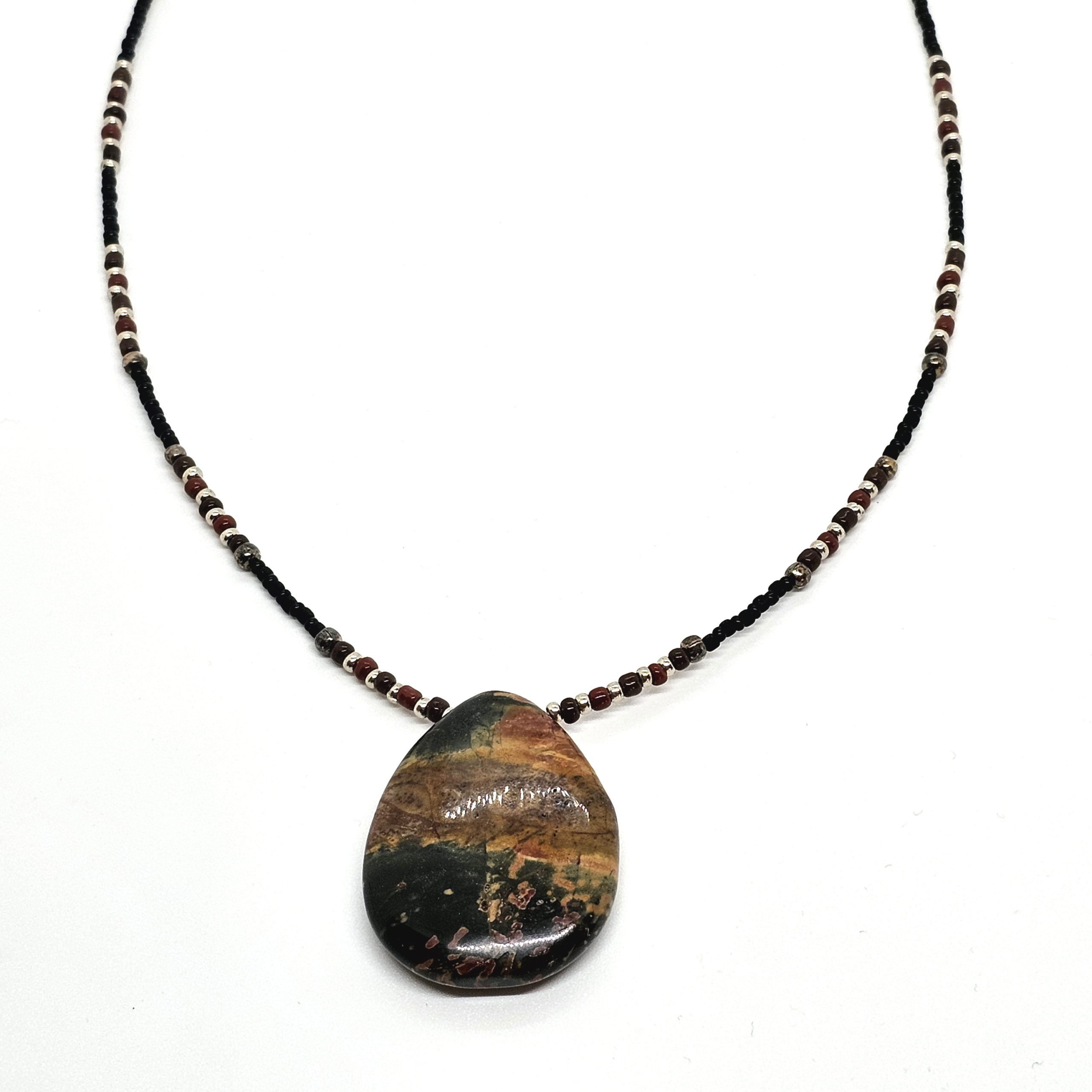 Collier avec pièce principale Jaspe Paysage (diamètre 4x3cm), petites perles japonaises. Longueur du collier : 52cm. Fermoir en métal.