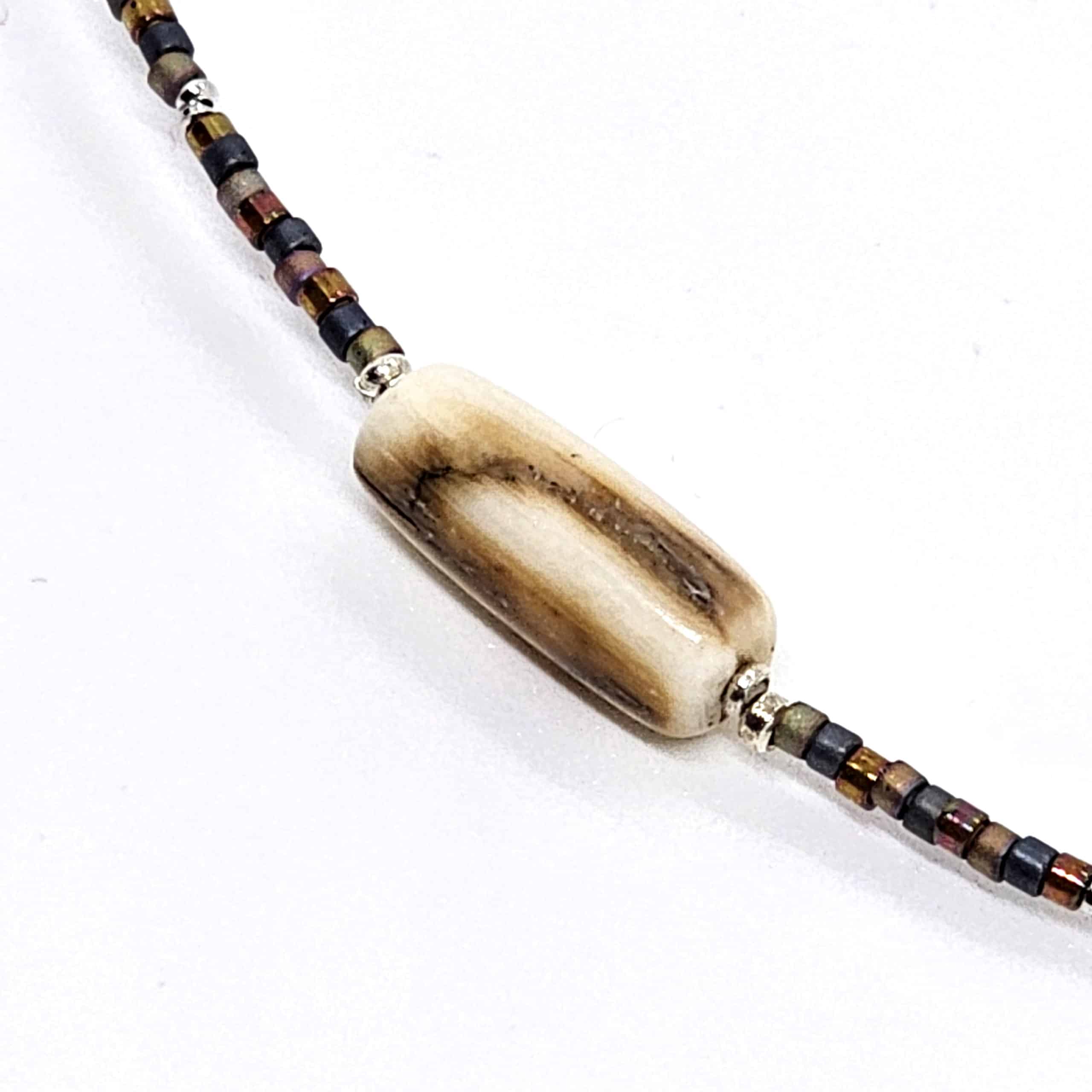 Collier avec perles japonaises. Pièce/perle centrale en mammouth. Longueur du collier : 37-43cm. Fermoir en métal.