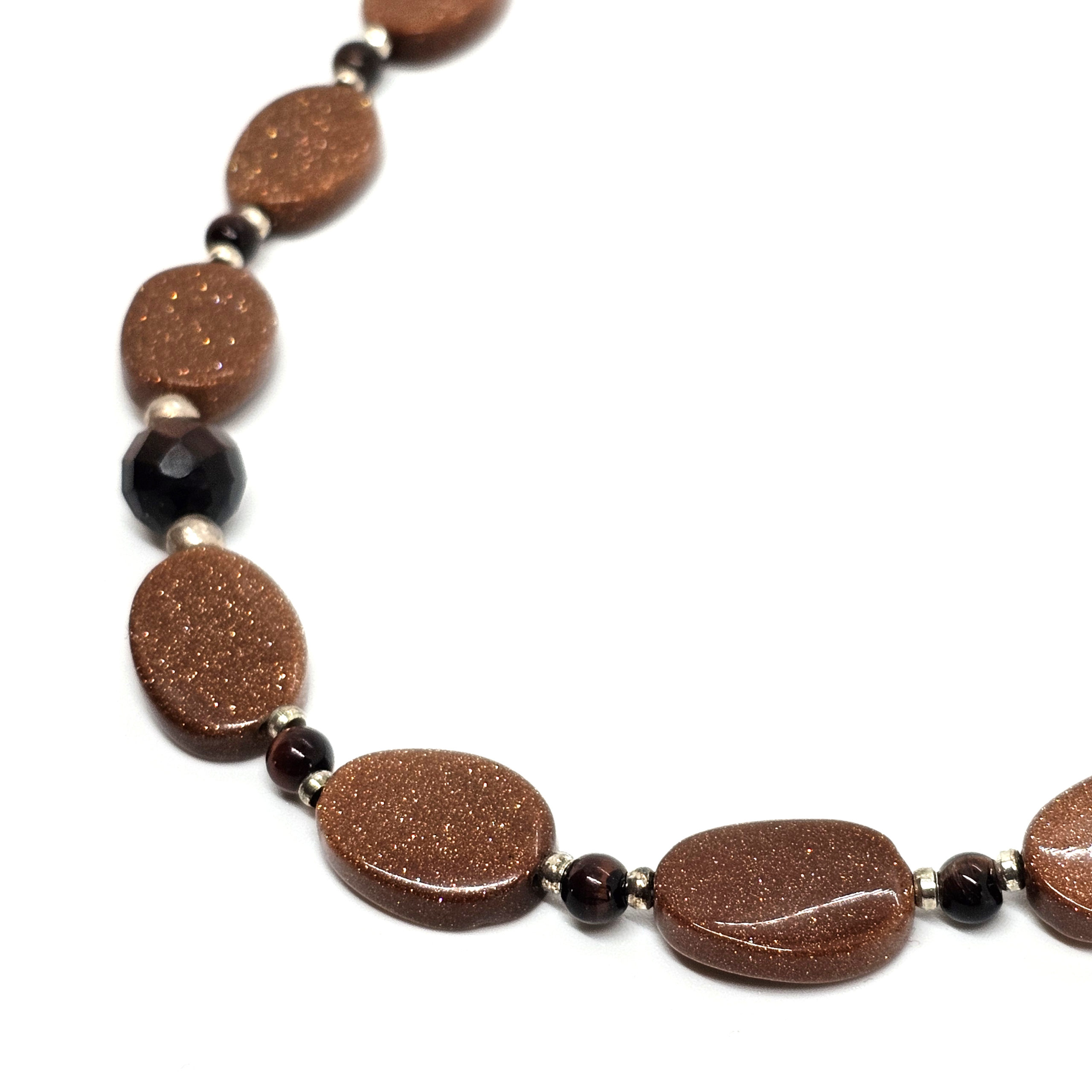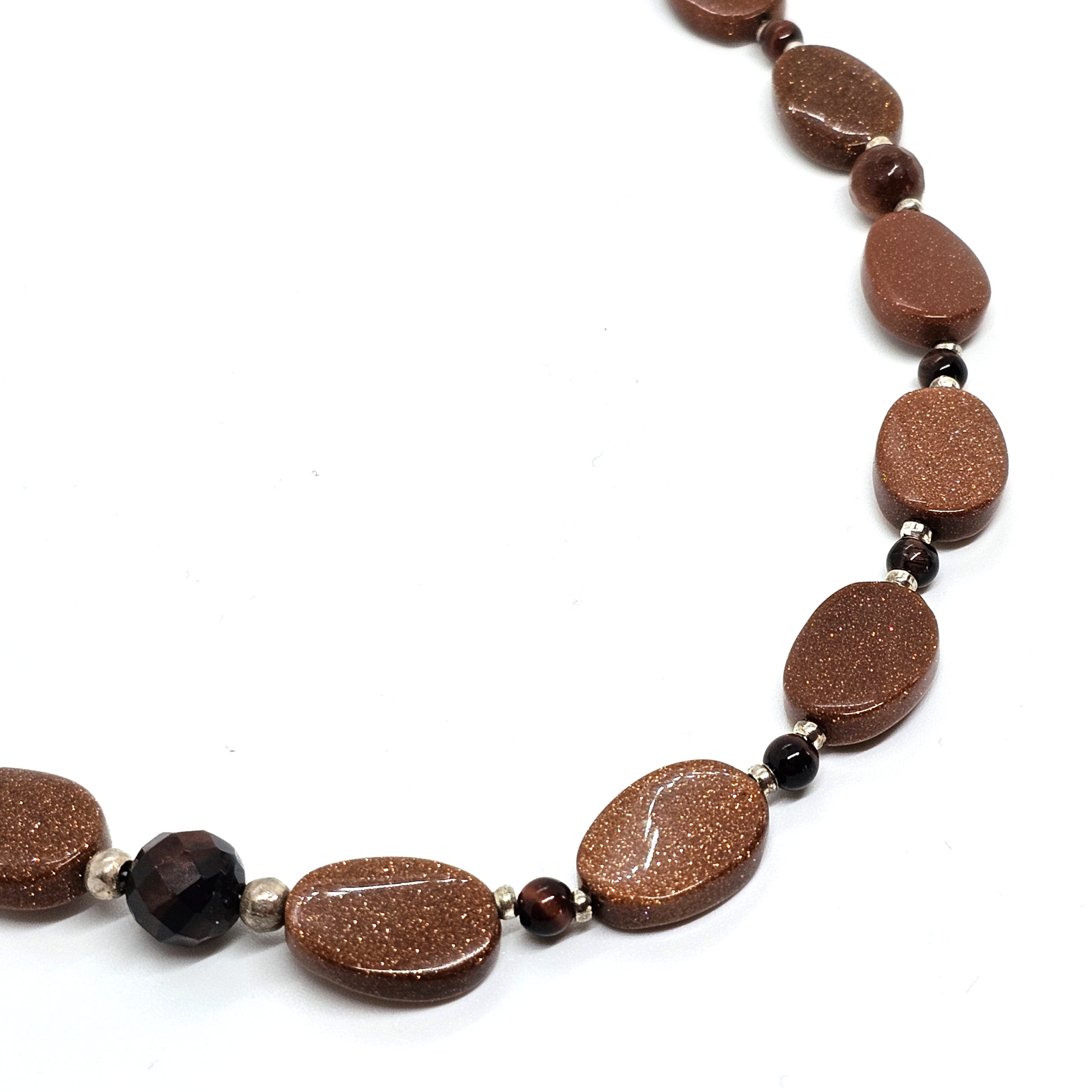 Collier avec pierres “Goldstone” et pierre Tiger-Eye “Oeil de Tigre” et argent. Longueur du collier : 45-53cm. Fermoir fantaisie.