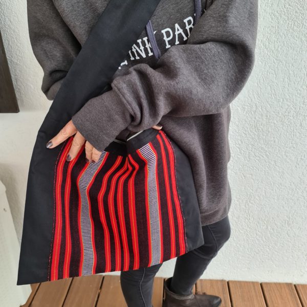 Sac birman confectionné par Barbara avec du tissu tissé aux Philippines. Motif tissé sur les deux côtés. Doublure beige. Poche pochette à l’avant.